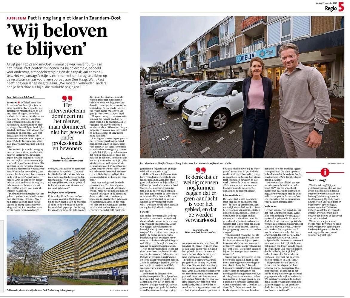 Bewoners uit Poelenburg en Peldersveld kwamen 25 november bijeen in het Zuiderzee College om terug te kijken op vijf jaar Pact. Het was een goedbezochte avond vol verhalen.